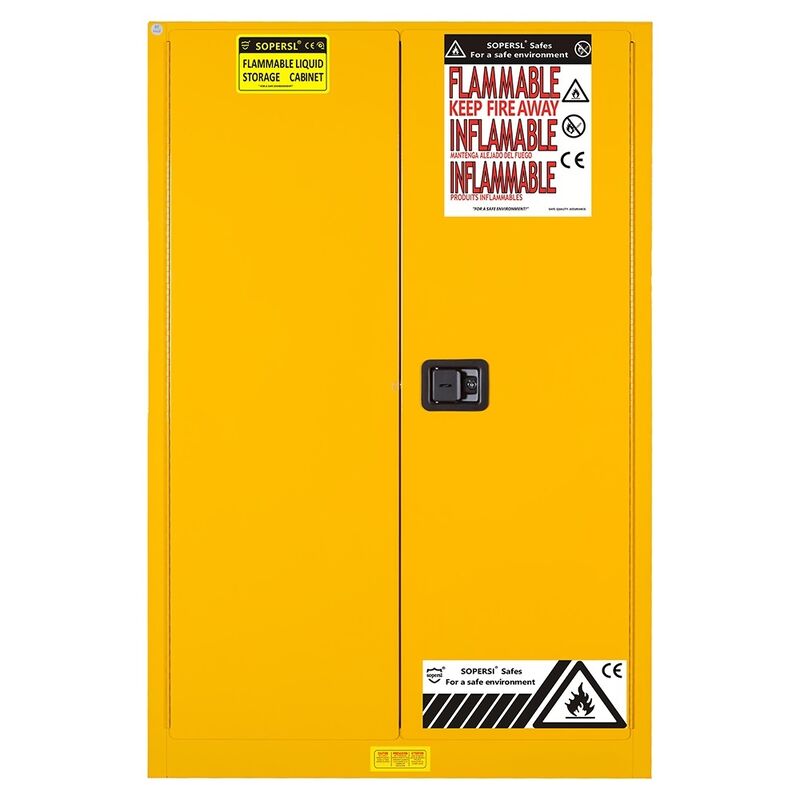 El gabinete de seguridad inflamable SUPER de 45 galones (capacidad de 170L) está diseñado para el almacenamiento de líquidos inflamables de las clases I, II y III.Espacio de aire aislante de 38 mm, dos respiraderos de 2 pulgadas para detener el destello, y un sumidero de contención de derrames de 2 pulgadas, cumple con las normas NFPA 30 y OSHA 1910.106.